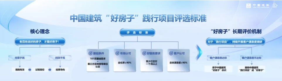 中建集团以“措施有效、过程受控、结果导向”为原则,对严格按照营造体系完成“好标准”“好设计”“好材料”“好建造”,顺利交付进入到“好服务”阶段的项目,按照解决“六不六防三省三要”的101项百姓基础需求、可售住宅去化比例达到90%以上、至少已交付一个月以上、收房业主总体满意度达到90%以上等四项标准来评选认证为践行项目。中建集团将继续委托第三方对认证项目连续三年开展客户满意度调研,满足标准后确定为中国建筑“好房子”项目。