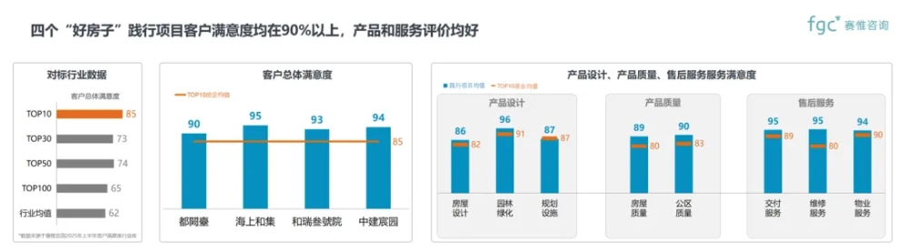 根据赛惟咨询客户满意度调查,首批四个践行项目客户总体满意度均达到90%及以上,客户对产品设计、园林景观、园区设施、产品质量、公区质量、维修服务、物业服务的评价均显著高于TOP10房企均值。